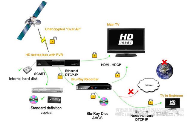 國內HDCP技術則主要應用在高清顯示設備及藍光播放設備,如高清電視機、顯示器、藍光DVD等設備。對于高清機頂盒,它的HDMI接口硬件一般內置了HDCP功能,但要啟用該功能,必須要軟件配合,并且通過HDCP認證,才能取得合法的密鑰。國內機頂盒播放的節目源,主要來自衛星、有線、地面等節目運營商,內容大多數沒有采用HDCP加密,高清影視節目源也比較匱乏。所以,國內銷售的大多數高清機頂盒并沒有啟用該功能。