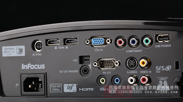 在機身背部IN8612提供了豐富的輸入輸出接口:兩組HDMI 1.4接口、VGA、S-Video、復合視頻端口以及色差接口,還有一組3.5mm立體聲輸入輸出接口和一組RCA立體聲輸入(L/R)接口。應該來說,這樣的接口完全滿足了家庭的連接各類需求。比如同時連接藍光播放機、高清機頂盒以及游戲機等等。