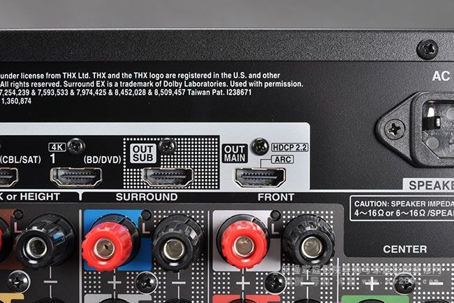 本機(jī)共提供了7進(jìn)2出的HDMI端子(其中一組輸入在前面板),數(shù)量不少,不過要留意,當(dāng)中支援4K/60p輸入的端子為第1、2、3、4組HDMI輸入,和前面板的輸入,以及2組HDMI輸出。支援HDCP 2.2的為第3組輸入和Main out主輸出。另外本機(jī)還支援Zone2和Zone3,能一臺機(jī)器搞定多房間使用。