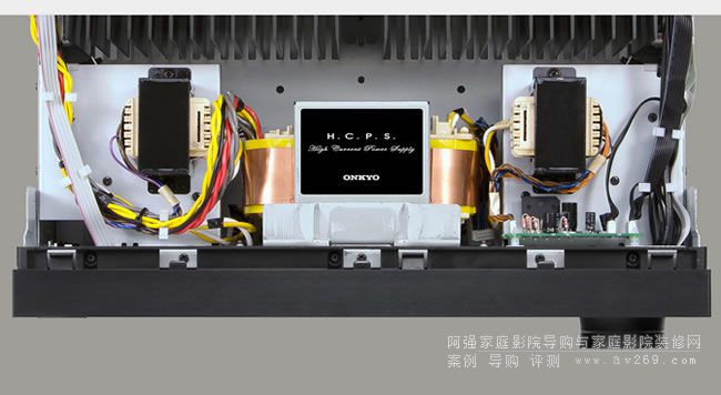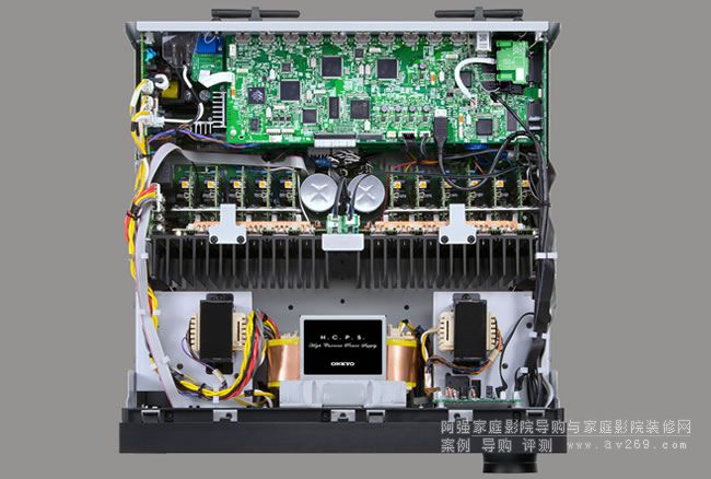 Onkyo TX-NR3030重量高達22公斤,是一般環擴的兩倍,可見其機箱結構與內在電源變壓器等元件份量有多扎實。從圖中可見整個機箱內部劃分為前、中、后三個獨立分區,最前方靠近面板處有三顆電源變壓器坐陣,中間為11聲道后級電路,靠近背板的則是數位處理與類比前級電路。