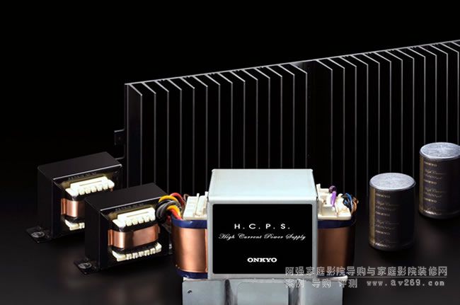 接著來看「高電流傳輸」,在機身正中央有兩顆體積不小的電解電容,以相當厚實的「銅條」連接兩側功率晶體(目的在縮短供電路徑并降低電力損耗)。當電力經變壓器整流過后,負責供應「11聲道后級」電路的電源,就會透過這兩枚Onkyo訂製高容量(15,000μF)電解電容作濾波,如此龐大的儲電量,可使功率放大電路在高輸出狀態下依然維持穩定、能量充沛。圖中散熱板前方所顯示的,就是TX-NR3030內部所採用的變壓器與電解電容,看得出電源元件品質相當高,透過如此整體的高電流配套設計,讓本機擁有強悍威猛的驅動力,即使搭配靈敏度、阻抗偏低的難推喇叭也沒問題。