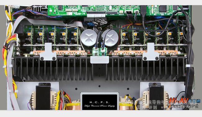 接著來看高電流的最后一環「高電流輸出」,照片正中央向左右延伸的金黃色長條狀物體,就是前面提到連結功率晶體的銅條。本機的11聲道后級在驅動電路板為各自獨立的配置,上圖中央濾波電容左右兩側各有五塊及六塊垂直安裝的驅動電路板(功率晶體直接鎖固在散熱片上)。當然,Onkyo在業界知名的WRAT寬頻放大電路也在本機發揚光大,以具備寬頻特性的放大元件架構簡潔電路,降低整體的負回授,每聲道使用一對Toshiba大電流(額定18安培、瞬間最高達35安培)之功率晶體TTA0001/TTC0001推挽輸出。