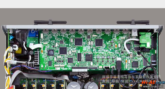 機身內最后面上層的數位處理主板,包括HDMI介面、數位影像處理電路與多聲道處理電路。本機以Marvell 88DE2755晶片進行數位影像處理,它可將SD與HD視訊上轉為4K。至于多聲道處理,則由兩枚德州儀器製作的32bit浮點運算DSP晶片擔綱,在完成Dolby Atmos等數位音訊的多聲道解碼及THX等后處理,以及自動系統設定與校正(包含Onkyo自家研發的AccuEQ空間等化校正處理)之后,音訊就會來到最右側豎立的電路板進行多聲道數位類比轉換。阿強家庭影院導購網歡迎您光臨!