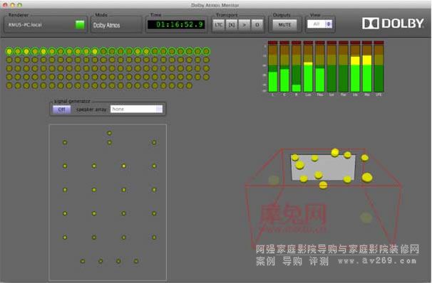 傳統多聲道編碼的基礎就是考慮有幾個聲道,然后把聲音放進去。而Dolby Atmos只用考虛這個聲音的舞臺是什么樣子,然后上面發生了什么事情,產生了什么事件。至于,要用到多少聲道,喇叭里在發出什么聲音,電量制作人就完全不用考慮。因為Atmos的系統會依據現場的播放條件,自動計算并利用這些喇叭呈現出完整的全景聲音效,無論喇叭的數量與位置是什么狀況,都會被靈活的利用,這就是基于聲音對象的Atmos邏輯。所以,Atmos系統必須有來自上方的聲音,這是為了給出聲音的立體座標位置。至于,這個方面的音箱是安裝在天花板,還是由地上的音箱把聲音打到天上,都無所謂了。