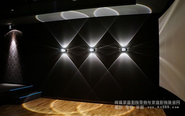 棱鏡聚光燈營(yíng)造的整齊富有美感的光影。為影音室側(cè)面的吸音墻體增彩!