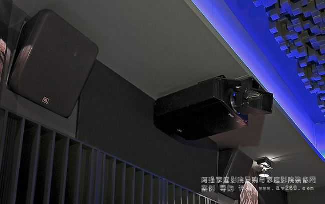 后部觀影區(qū)域采用兩排共七人位沙發(fā)。兩側(cè)對(duì)應(yīng)四只側(cè)環(huán)繞音箱。音箱為JBL 8320,經(jīng)常在專業(yè)影院里面會(huì)出現(xiàn)。