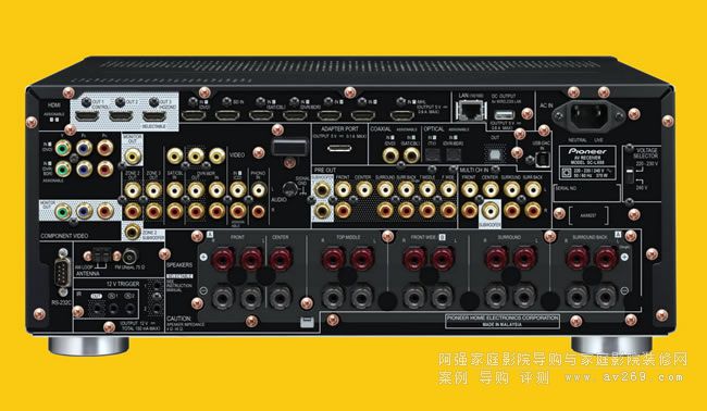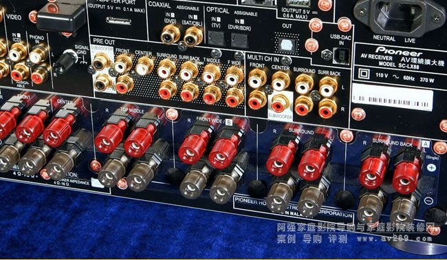 SC-LX88內建九聲道后級,但背板下方配備有11對喇叭端子,可以依據不同的喇叭設定做輸出,Pioneer很貼心地在喇叭端子區貼覆了透明塑膠片,可避免用家連接喇叭線時不小心碰觸機箱造成短路。在喇叭端子群上方,是本機的多聲道前級輸出及輸入端子群,前級輸出部分為11.2聲道配置,前級輸入則為7.1聲道。