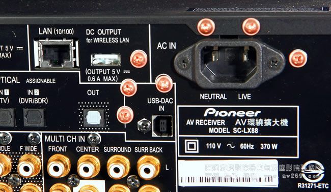 電源線插座旁邊有乙太網路連結端子,以及數位信號輸出入端子群,SC-LX88配備兩組光纖數位輸入與一組輸出,此外還有一個對應高音質音訊的USB DAC輸入,可直接連結個人電腦建構數位流音樂聆聽系統,這也是Pioneer高階環擴首創的特色。