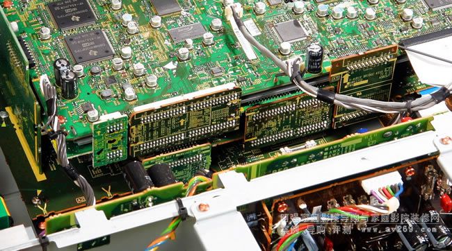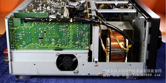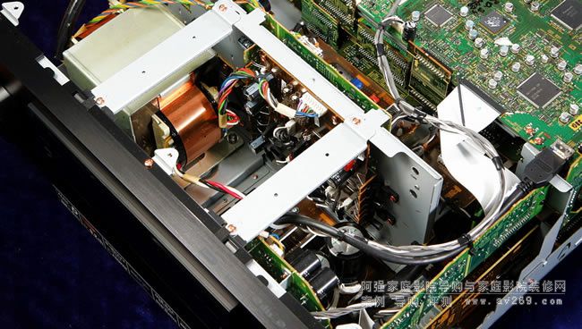SC-LX88移去頂蓋之后的模樣,前面約五分之二是類比電源供電區域,照片左上方角落豎立的是數位電路電源部分,機箱后半部是立體架構的視訊及音訊電路板。歡迎光臨阿強家庭影院導購網!