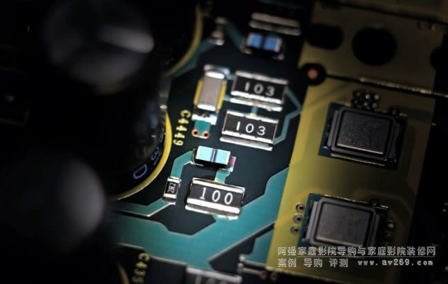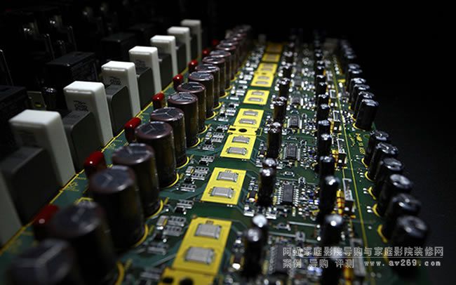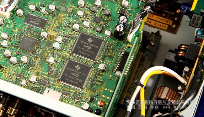 在最上層的數位電路板可發現兩顆有Dolby及DTS商標的大型晶片,它們是數位音訊解碼核心、德州儀器的Tl D808K013三十二位元DSP處理晶片,后續音頻的數位類比轉換則由兩顆各八聲道的ESS ES9016三十二位元DAC晶片負責。