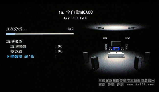 相較于其他環擴品牌的自動音場設定,SC-LX88的MCACC Pro量測項目多了許多,如此方能精準得知視聽室空間的聲學特性,并精準匹配各喇叭(包含單體)與聆聽位置的關系。MCACC Pro一開始會先檢測環境噪音與麥克風,接著則檢測各揚聲器的連結狀況。