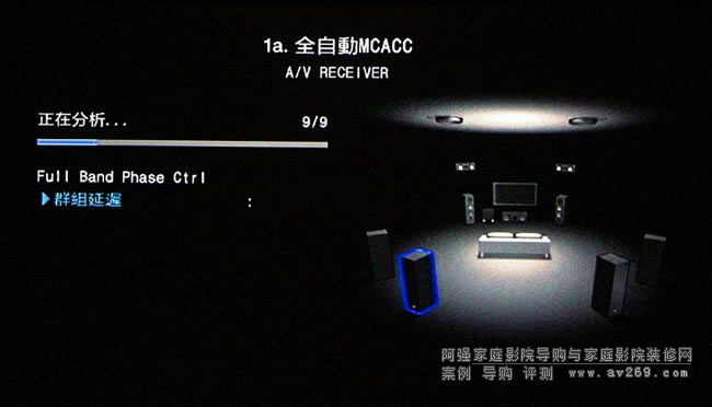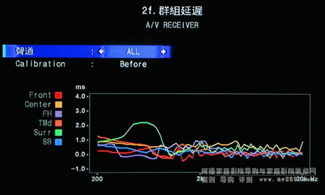 這就是MCACC Pro對各聲道喇叭所做的群組延遲狀況量測,以及可處理至同步一致的調整,這是為了讓各聲道喇叭的各頻段到達聆聽位置的時間相位都可同步,如此方能夠有精準的音像定位及移動表現。