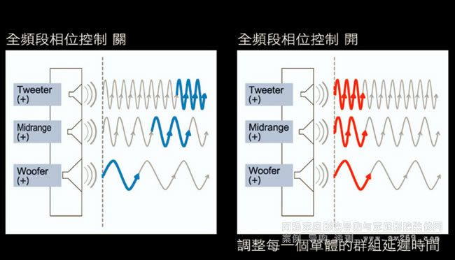 「全頻段相位控制技術」(Full Band Phase Control)也是Pioneer達成如同錄音室般精準重播的關鍵,此技術可補償多聲道音訊在「多音路揚聲器本身」與「多聲道揚聲器」之間由于分音器或其他作用的影響,而造成每支喇叭(甚至單一喇叭的各個單體)相位不同步的問題。上圖所顯示的就是一支三音路揚聲器,其高音、中音、低音的發聲就有不同步的狀況,更別提與其他聲道喇叭如何協同合作。