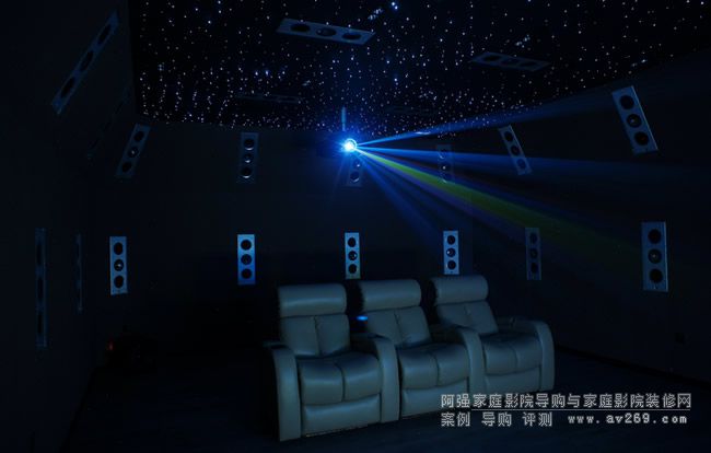 考慮到不影響相鄰的房間,使用實體磚+減震龍骨+隔音氈+吸音棉做復合結構的隔音處理,地面采用浮筑結構,制作了隔音門。音箱布線采用了26+4的結構,此設計源于AURO 3D的13,1基礎衍生,使用多臺音頻處理器實現密不透風的聲源分布。音箱采用入墻安裝方案,配合透聲幕布局。低頻方面我們采取多炮在房間四角分布方案,墻面采用訂制的穿孔板加不同空腔的處理辦法,顏色涂刷非反光深色。阿強家庭影院導購網!