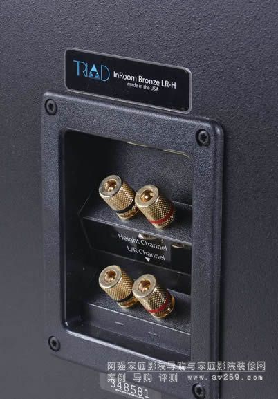 在安裝高度方面,杜比公司針對(duì)天花反射式全景聲音箱也給出了一些建議。最佳的安裝高度在0.9~1.5m范圍內(nèi),而且安裝高度要與人坐在座位上的耳朵高度保持一致。實(shí)際上,我將InRoom Bronze LR-H的高音單元作為標(biāo)準(zhǔn),讓高音單元與人耳高度保持一致即可。而數(shù)量方面,基本要求使用2只,或者4只。到底怎么分配?如果使用2只天花反射式全景聲音箱,那么杜比公司建議你在前置左/右聲道音箱中使用。如果是4只,那就在前置左/右聲道音箱和后置左/右聲道音箱中使用。另外,用家還需要注意InRoom Bronze LR-H的接線柱標(biāo)識(shí),千萬(wàn)別以為那是雙線分音接線柱。