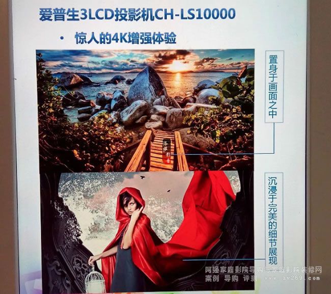 4K投影在幾年前就已經有了,但4K片源一直較少,所以用戶實際也很少體驗到4K的畫面。而愛普生此次帶來的4K激光投影機CH-LS10000不僅具有4K顯示功能,而且還應用了愛普生的“4K增強技術”,配合愛普生超級解像度技術及精細化的調校,可將藍光等全高清(Full HD)影像內容增強至4K超高清效果,解決了4K片源匱乏的問題,讓用戶暢享4K畫質。 在展會體驗館現場,我們可以看到在播放1080P演示片時,當開啟“4K增強技術”之后,帥哥的胡須,美女臉上的紋理立馬細膩真實的許多,不像原始畫面在超大屏幕上播放像做了磨皮美化似的。