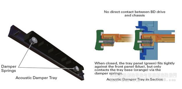 聲學(xué)吸音托盤(pán)採(cǎi)用托盤(pán)面板透過(guò)阻尼彈簧與托盤(pán)主體連接的設(shè)計(jì),大幅提升吸震效果,有效消除由光碟機(jī)內(nèi)部透過(guò)托盤(pán)傳達(dá)到機(jī)殼的振動(dòng)干擾。