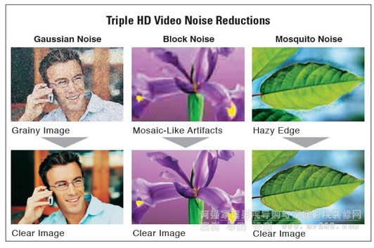 >「Triple HD Noise Reduction」能有效地減少如MPEG壓縮格式類(lèi)型的內(nèi)容中的「粒狀隨機(jī)訊噪」 (Grainy random noise)、塊狀雜訊 (Block noise) ,以及蚊影噪訊 (Mosquito noise) 而提供清晰和高品質(zhì)的影像。