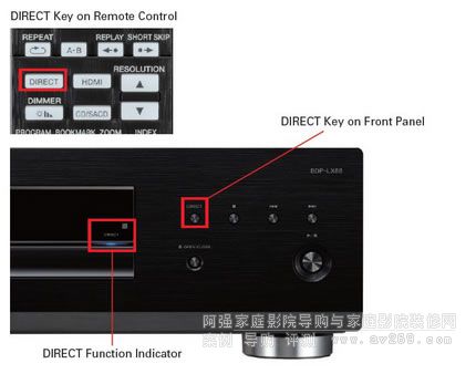 只要按下在遙控器或前面板上的「DIRECT」按鍵即可啟動(dòng)直接功能,關(guān)閉會(huì)影響類(lèi)比音訊輸出的音訊/影像的數(shù)位訊號(hào)處理,讓你享受純淨(jìng)高品質(zhì)的高解析兩聲道音樂(lè)檔案或CD。阿強(qiáng)家庭影院導(dǎo)購(gòu)網(wǎng)歡迎您!