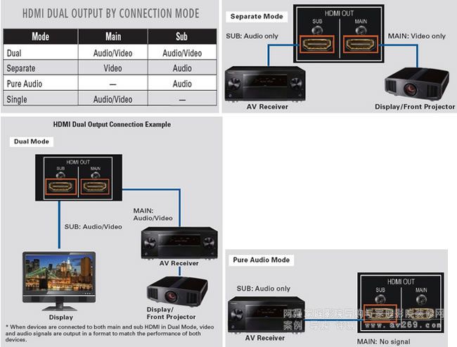 藉由雙HDMI輸出端子,音樂(lè)影像訊號(hào)可分別指派至主副端子輸出,獲得更優(yōu)異的訊號(hào)傳輸,除了「分離模式」外,「雙重輸出模式」可同步輸出聲音及影像訊號(hào)至兩臺(tái)顯示器上,而「純音模式」即使連接兩臺(tái)裝置道主副HDMI端子上時(shí),仍可提供最優(yōu)質(zhì)的聲音訊號(hào)輸出。