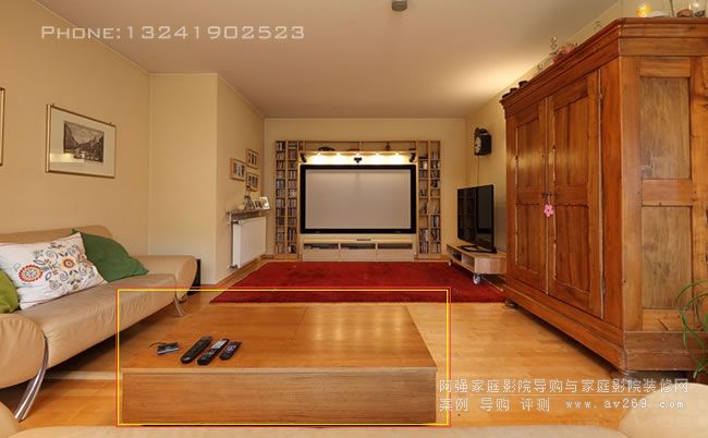 大尺寸的畫框銀幕布被安置在簡易的CD架中間,三只前置小音箱掛在幕布上沿,均衡擺放,視覺效果良好。