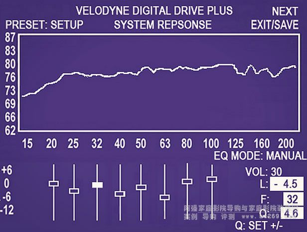 藍線就是伺服控制系統發揮作用了,可以看到整個頻率響應曲線往后移動,低頻延伸下到20Hz。圖中黑線是關閉了伺服控制功能,藍線則是開啟此一功能。可以看到關閉伺服控制時,頻率在60Hz以上相當平坦,但60Hz以下卻是快速滾降,至30Hz已經相當貧弱,實在不太像是一部超低音應有的表現。反觀藍線,也就是開啟伺服控制功能,雖然頻率響應曲線不太自然,且在60Hz以上快速滾降(沒差,這本來就不是我們要的部分),但60Hz以下至20Hz頗為平坦,甚至18Hz都還不錯,表示它可以再生極低頻段,伺服控制確實有效。Velodyne自行開發的等化系統,操作時采用圖形介面,你可以把Digital Drive Plus直接連接顯示器,或是在PC上安裝Windows版的軟體,借由電腦來進行上述步驟也可以。