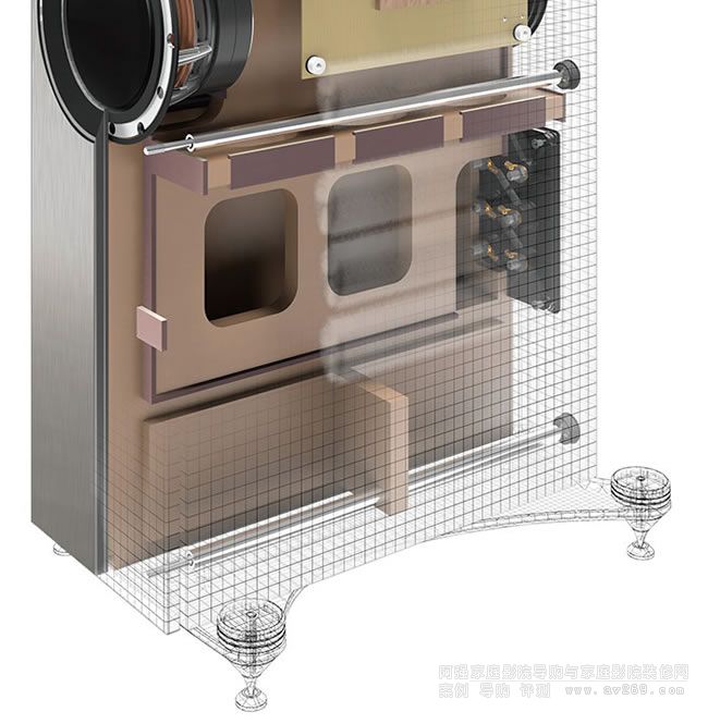 Reference 5的剖面結構,可以看到低音單元和同軸單元均有獨立的腔體,且有強勁的加強結構,可提高箱體強度