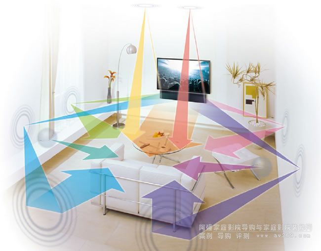 位于兩支低音單體之間的單體陣列負責水平方向各聲道的發聲:除了中央聲道是直接對著聆聽區域發聲以外,其他聲道的聲音射束都是利用側牆與后牆反射再抵達聆聽座位,水平方向的聲道數有7聲道,左右兩側的單體陣列分別發出「左上方聲道」與「右上方聲道」的音束,利用天花板向下反射成為上方的「.2」聲道,因此只要用本機搭配一支超低音喇叭,就能獲得7.1.2聲道三度空間環繞效果。