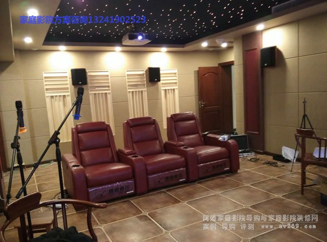 家庭影院裝修完畢r后的設(shè)備安裝現(xiàn)場,所有影音設(shè)備進場到位,家庭影院系統(tǒng)采用的是全套美國JBL音箱組建的7.1多聲道系統(tǒng)。而幕布使用的是定制142英寸畫框銀幕。