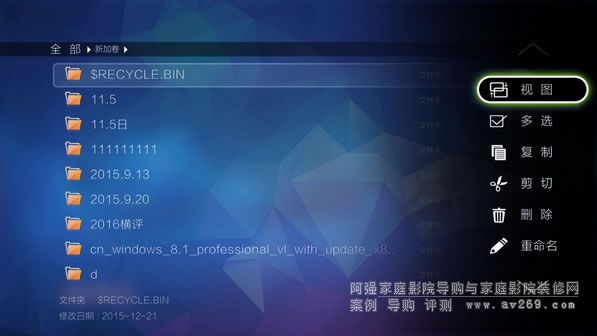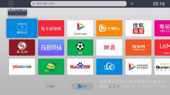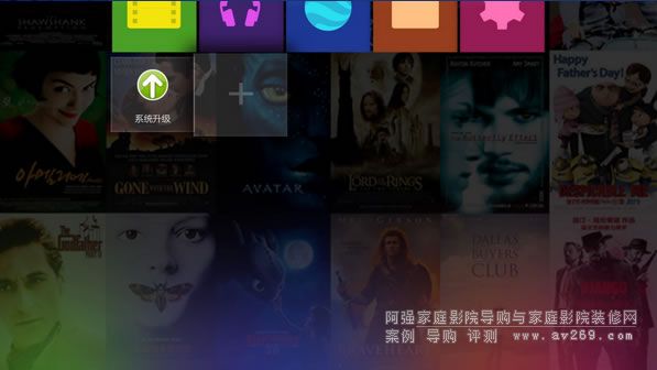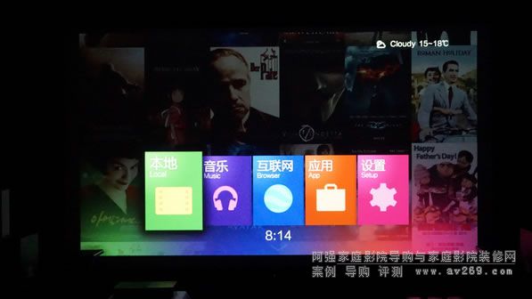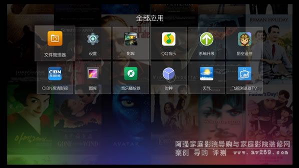 系統首頁由三部分組成,第一部分中間的5大常用頻道入口,包括本地(可管理USB移動存儲、本地磁盤、SATA硬盤、局域網共享文件)、音樂(QQ音樂)、互聯網(網頁瀏覽器)、應用以及設置,用戶可以通過這5大頻道入口非常迅速就能找到自己所需。第二部分當光標停留在首頁按向上方向即可跳出影庫功能,進入影庫管理;第三部分當光標停留在首頁按向下方向鍵,可以進行自定義快捷方式,從而快速進入應用。