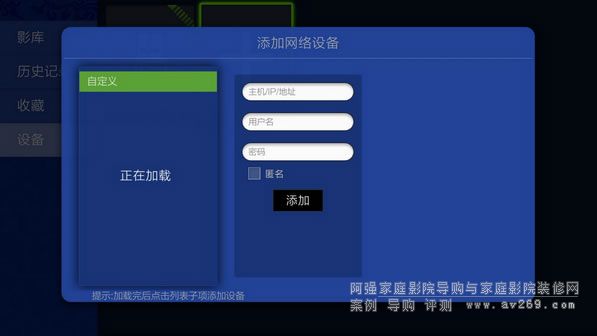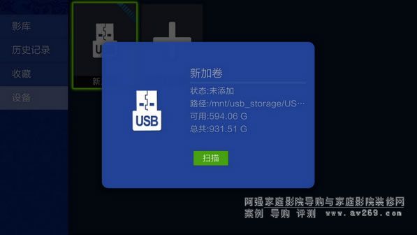 在使用海報墻之前,我們需要添加設備,可以添加本地設備,也可以添加局域網內的網絡設備,順次進入“影庫 設備 選擇移動存儲設備/添加網絡設備 掃描”即可進入掃描和匹配海報、簡介、分類等信息。