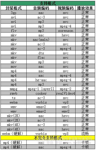 除此之外,筆者通過安兔兔視頻對開博爾Q10的解碼能力進行客觀測試,在30個不同格式不同音頻的視頻測試樣本當中,僅有兩個文件發生了卡頓現象,其他都能正常流暢播放,這也是目前為止筆者測試過最好的成績,詳情請看下表: