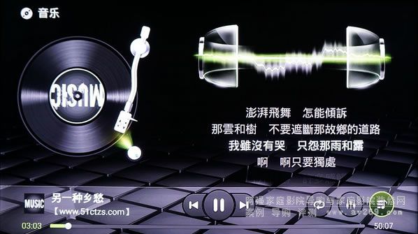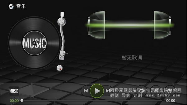 開博爾Q10內置功能強悍的音樂播放器,官方參數標明可支持的音頻播放格式包括MP1/MP2/MP3/WMA/OGG/AAC/M4A/FLAC/APE/AC3/AMR/RA/WAV,播控界面左側為黑膠轉盤,在播放音樂的時候會有類似于黑膠轉盤播放時候的轉動動畫,右側為閃電律動和歌詞顯示,可以根據音樂名稱自動聯網搜索歌詞,下邊框為播控欄,可對音樂播放進行控制。