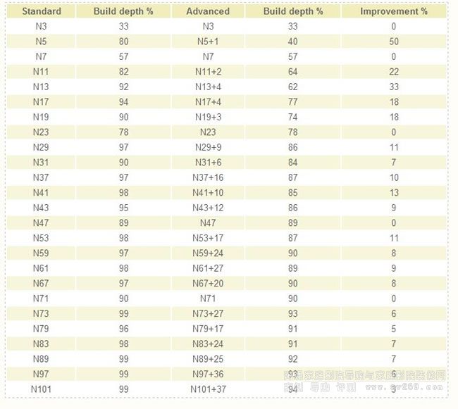 我們把這種改良擴散板稱作為N13+4型,+X取決于V的數值。下表是改良率,改良率%比越大,說明其深度降低越多。
