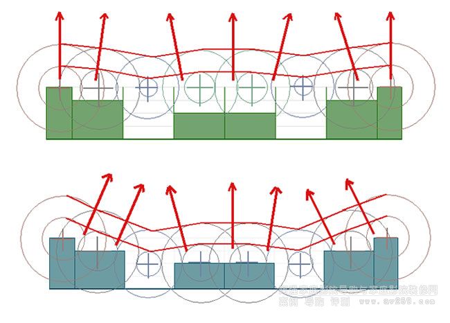 圖中我們可以看到紅色的箭頭指向,代表他們擴散板的角度不同,沒有翼片仍然是擴散板,但它不能再是QRD擴散板,這段有些詞匯不太理解,但文中不建議省略掉翼片。