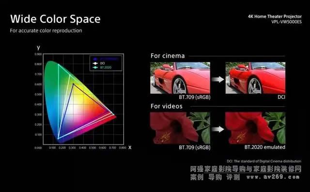 除了超清分辨率和HDR功能之外,VPL-VW5000ES還提供了更廣的色域,達到了DCI-P3標準——這也是美國數字電影院所使用的色域。索尼表示,這款投影儀還能通過專業(yè)校準還模擬ITU-R BT.2020色域(4K電視所使用的色域)。