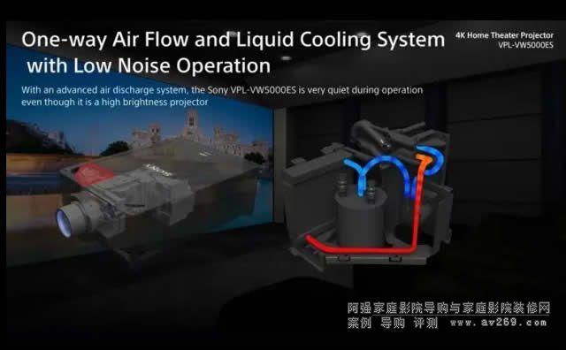 投影儀通常都存在發(fā)熱量大的問題,因此大多數投影儀都會通過風扇來降溫。但是,風扇所產生的噪音對于用戶的觀影體驗也會產生影響。索尼為這款投影儀開發(fā)了一套水冷系統(tǒng),從而大幅降低了它的工作噪音。據稱,VPL-VW5000ES在普通模式下的音量僅為35分貝,而低亮度模式更是只有32分貝。