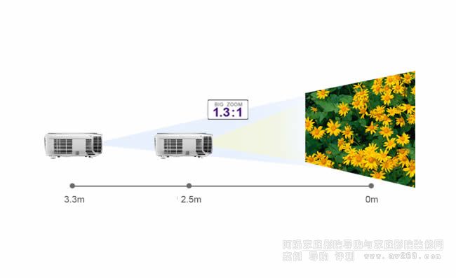 驚人的變焦功能可適應各種空間的投射距離享受大屏幕娛樂,無需復雜的安裝甚至吊裝