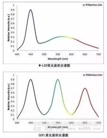 一起看看LED顯示器兩種主要發(fā)光模塊【W(wǎng)-LED(常用)和GB-LED】的光譜組成。如下圖:
