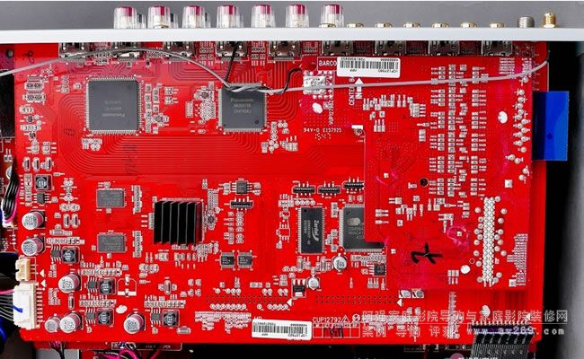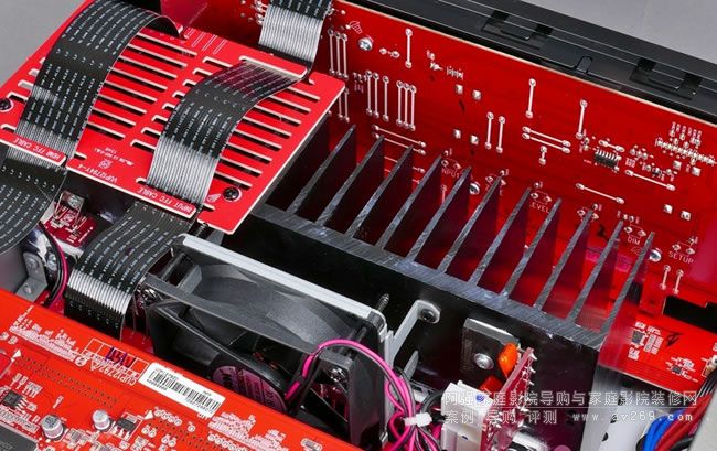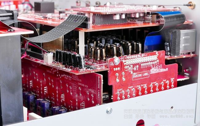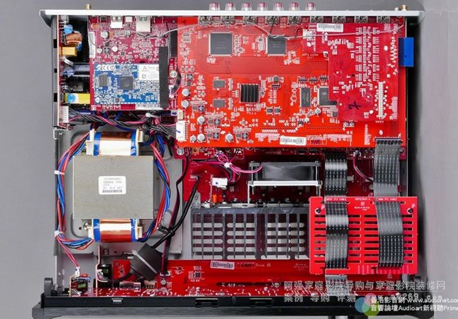 HDMI輸出入晶片配置在數位電路主板靠近背板端子處,負責本機多聲道處理的DSP晶片在中央偏右的位置,在它右上方零件面朝下的電路板是本機的數類轉換電路,它是在本機靠右的位置,可以與網路、電源電路保持最遠距離以漸少雜訊對聲音純度造成破壞。