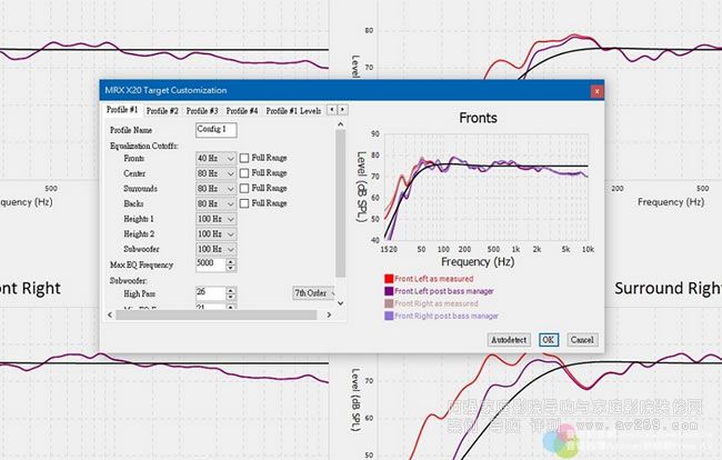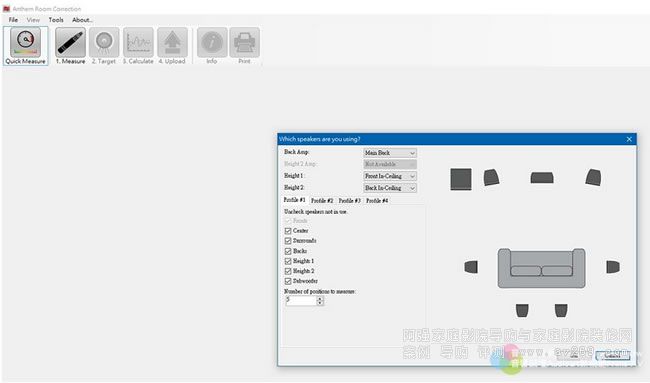 ARC2有「自動」與「手動」兩種設定方式,不管哪一種,測試調整的精確度皆相同,其間較大的差別在于「手動」可以自訂各聲道分頻點、超低音喇叭的工作范圍與所有喇叭的等化頻段范圍,測試開始前,ARC2會要求導入測試麥克風的校正檔,并確認喇叭配置的狀況。