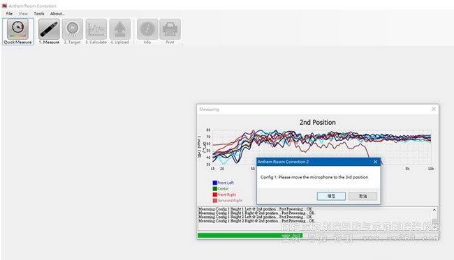 Anthem的等化校正很不一樣, 他家的ARC(Anthem Room Correction)源于1990年代加拿大國家研究院(NRC)開發的技術,由Anthem正式應用在製品上、并歷經多代改良。我用筆記型電腦安裝最新版本的Anthem Room Correction 2(ARC2)程式、連接「ARC 1M」測試套件、導入測試麥克風的專屬校正檔,隨即執行「儀器級」的精準頻響測試。ARC2的測試分為「自動」與「手動」兩種模式,它們都會要求測試五個位置、透過網路控制MRX 720發出各聲道的測試音,每次測試,ARC2都能在電腦畫面上呈現受測聲道的頻響曲線、正如同頻譜分析儀一般。隨后ARC就以各位置實際測得的頻響狀態為本、擬定各聲道喇叭頻響的等化目標(理想曲線),最后再計算各聲道數位等化調整、使最終響應逼近目標曲線,最后把計算所得的等化調校結果透過網路上傳給MRX 720執行。
