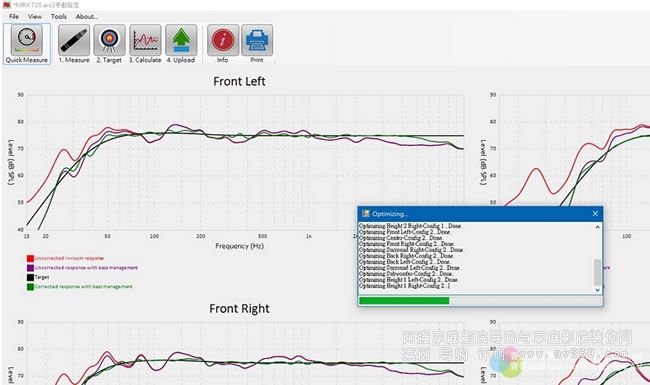 ARC測試過程中能看見各聲道的頻率響應曲線,將測試結果存檔之后用家可參照本機實測各聲道的低頻響應狀況設定各聲道的「Equalization Cutoff」與超低音響應的低頻截止點(SubwooferHigh Pass),設定完畢后點選Calculate、本機就會計算各聲道的等化調整,最后再點「Upload」即可透過網路將等化調整的狀態由電腦上傳至MRX 720。