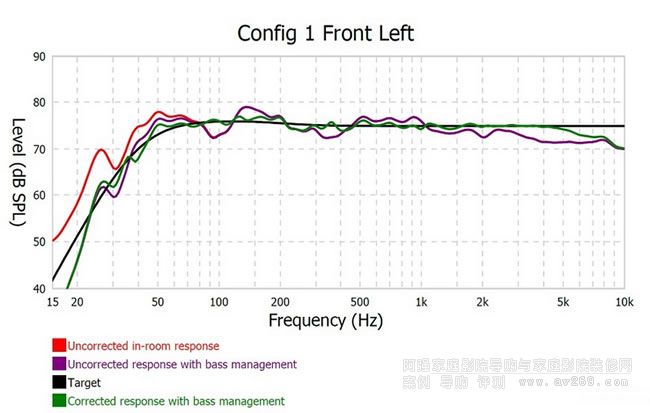 ARC執行測試完畢后可以作出一份完整的測試調整報告,是我這回試聽使用的左聲道喇叭:紅色曲線是在聆聽位置實測的頻響(未等化)、紫色曲線是加入40Hz低通濾波的響應曲線(未等化)、黑色是等化調整的目標曲線,綠色則為經過ARC校正的等化結果,響應平直的程度就連玩多聲道的老手看了都會噴鼻血啊!幾乎將視聽空間的癖性完全去化、彷彿牆面與天花板都不存在