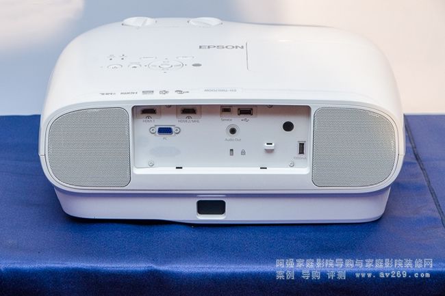 這款投影機(jī)后方的左右兩側(cè)都有設(shè)置了一個10W的喇叭,而中間區(qū)域還有提供兩組HDMI、USB、D-Sub以及3.5mm音源輸出等端子。