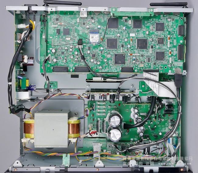 這是SC-LX701的機內俯視圖,電源電路在機箱內佔據了一半以上的空間:前半部是聲頻電路的電源,以左前方的大型銅隔離變壓器供電,多組次級圈輸出連接到右前方的多塊電路板作整流、濾波與各部電路使用的多組穩壓,左后方直立的交換式電源板則供電給數位電路。