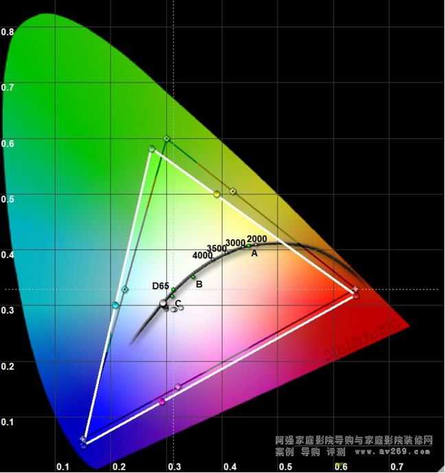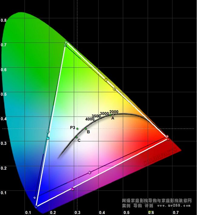 本機(jī)采取2D顯示時(shí)可以選擇5種顏色模式,圖1至圖5依序是動(dòng)態(tài)、明亮劇院、自然、劇院、數(shù)位劇院等五檔的儀測(cè)結(jié)果,前三檔的實(shí)測(cè)色域(白色腳型范圍)大致與HDTV標(biāo)準(zhǔn)REC.709(黑色三角形范圍)相當(dāng),然而在4K時(shí)代、色域超大的BT.2020以逐步開(kāi)始應(yīng)用,「比誰(shuí)的顯色范圍更廣」是今后4K顯示器材性能競(jìng)賽很重要的項(xiàng)目,而TW8300W在顏色模式設(shè)為劇院(請(qǐng)見(jiàn)圖4)與數(shù)位劇院(圖5)的模式下顯色范圍大得嚇人、遠(yuǎn)遠(yuǎn)超過(guò)REC.709色域。請(qǐng)見(jiàn)圖6,我將參考的黑色三角形范圍改為數(shù)位電影DCI P3標(biāo)準(zhǔn),就可以看出本機(jī)的最大顯色范圍比DCI P3還要大,這是本機(jī)色彩表現(xiàn)能力優(yōu)于多數(shù)顯示器材的證明。