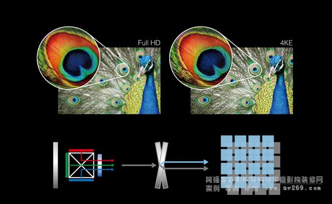 本機(jī)使用三枚0.74吋Polysilicon TFT Full HD液晶板作為顯像元件,由于是三板式機(jī)種、RGB三原色各以一枚液晶板負(fù)責(zé)顯示、不像單板機(jī)種是作RGB輪替顯示、因此不會(huì)有「彩虹現(xiàn)象」。現(xiàn)在家庭劇院玩家最在意的是4K顯示能力,問(wèn)題是EH-TW8300W如何用Full HD液晶板顯示4K呢?它與LS10000採(cǎi)用相同的分時(shí)顯示技術(shù),當(dāng)三枚液晶板顯示的RGB畫(huà)面疊合之后,在送入投影鏡頭之前的地方裝了一枚「4K Enhancement」元件,此元件可以讓輸出畫(huà)面作「微小的折射」,在TW8300W輸入4K視訊或啟動(dòng)「4K增強(qiáng)」的狀態(tài)下,每一個(gè)原生畫(huà)面都會(huì)作兩次顯示:第一次顯示的畫(huà)面「直接通過(guò)4K Enhancement元件」、第二次顯示的畫(huà)面則是「利用4K Enhancement元件折射」、將整個(gè)畫(huà)面向45度移動(dòng)半個(gè)畫(huà)素,使水平與垂直解析度倍增。在此我要特別想各位解釋:每個(gè)畫(huà)面「第一次顯示」與「第二次顯示」的畫(huà)面內(nèi)容并不相同、不是「重複顯示」而是「各自顯示」影像處理電路送出同一個(gè)畫(huà)面中不同的畫(huà)素,第二次的顯示是「第一次顯示相鄰的畫(huà)素」,因此在對(duì)應(yīng)4K視訊時(shí),兩次顯示的畫(huà)素都是以原生畫(huà)面存在的畫(huà)素為本、第二次顯示的畫(huà)面并非「虛擬」。