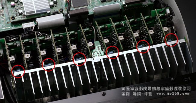 但是,可別以為只要把電路板排列得更緊密,就可以在同樣的空間塞入更多塊后級功率放大模組了!別忘了還有散熱的問題得要解決,原本9聲道后級只有18顆功率晶體,增加到11聲道之后就有多達22顆,在散熱片體積同樣無法增加的限制下,要怎么解決這個問題呢?仔細瞧瞧就可發現AVR-X6300H這11片后級放大電路板似乎有兩款樣式,其中一種在這個角度可看到靠近散熱片處有一支直立的電阻(以紅色圓圈標示處),另一款后級放大電路板從這個角度則看不到電阻,而本機的兩種后級放大電路板是交錯配置的。