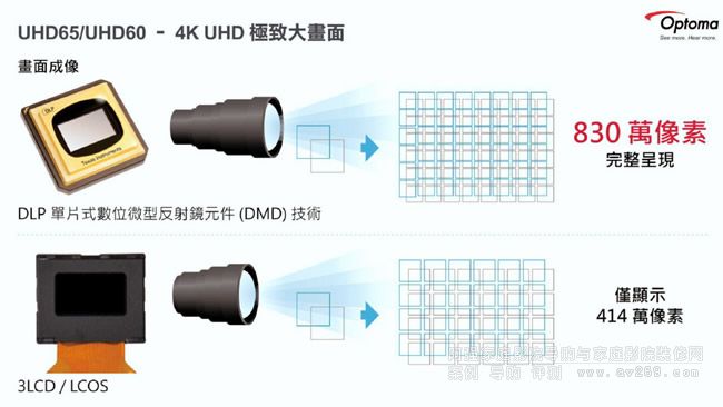 Optoma UHD65及UHD60的顯像核心是美國德州儀器的DMD晶片,兩者所配備的都是搭載2,716×1,528原生解析度微鏡片的0.67吋DMD單晶片,那要如何達(dá)到3,840×2,160的4K UHD解析度呈現(xiàn)?德州儀器的作法是讓每個(gè)微鏡片可做每秒高達(dá)9,000次的快速動(dòng)作,如此一來就可真實(shí)完整呈現(xiàn)3,840×2,160的830萬像素解析,無論用儀器量測或肉眼檢視,Optoma UHD65及UHD60確實(shí)可達(dá)到真實(shí)4K的精細(xì)畫質(zhì)。Optoma在發(fā)表會(huì)也特別強(qiáng)調(diào)他牌使用2K液晶顯像板位移上轉(zhuǎn)的處理方式,僅能顯示414萬像素。www.2008wb.com